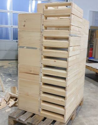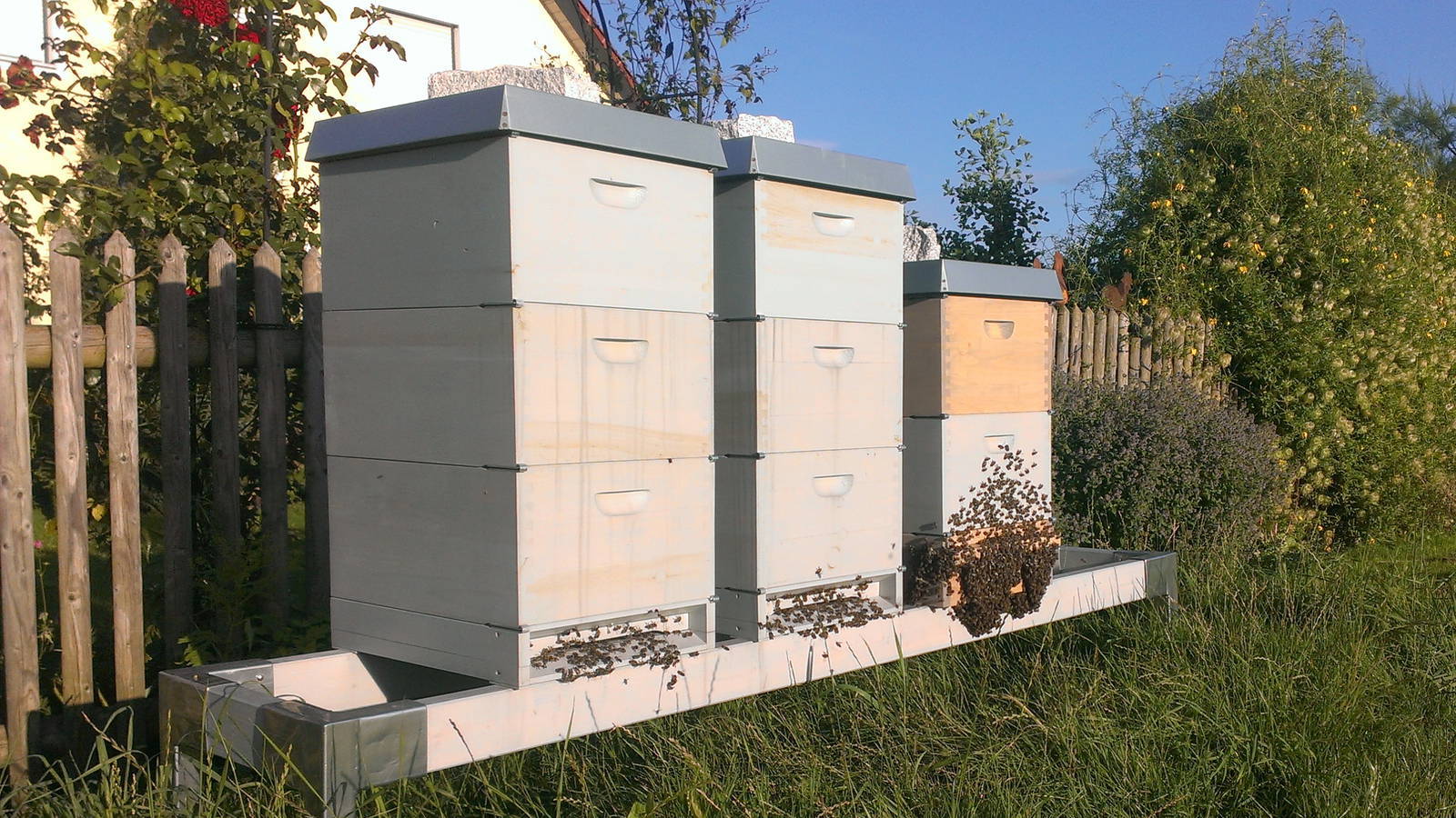 Unsere Bienenstöcke (auch Beuten genannt) sind allesamt aus bayerischem Holz hergestellt. Die Fertigung erfolgt weitgehend durch bayerische Schreinerbetriebe, in der letzten Zeit sogar teilweise durch uns selbst (nebenstehende Abbildung). Die Beuten sind innen komplett naturbelassen, außen werden sie zum Wetterschutz mit einer wasserbasierten Wachs-Lasur eingelassen, welche überwiegend aus natürlichen und nachwachsenden Rohstoffen besteht und aufgrund seiner Eigenschaften sogar für den Einsatz bei Kinderspielzeug geeignet und zugelassen ist. Neben Edelstahl-Beschlägen, -Gittern, -Draht und -Schrauben kommen keine weiteren Materialien zum Einsatz. Der Einsatz von Kunststoffen jeglicher Form ist für uns im Bienenstock ein absolutes Tabu!